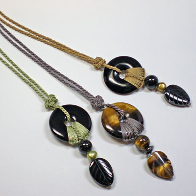 This is a design I have made for many years - a Marion's classic. I had stopped making this piece for a while, then brought it back by request with some new twists. It combines a thin handmade 3-ply cord attached to the donut with a Chinese button knot. Adjustable knots on the back of the cord allow to adjust the length of the cord by sliding the knots. The colors are kept to a minimum adding to the classic look of this design.