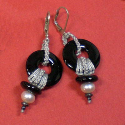 20mm black onyx donut with freshwater pearls. Knotted with nylon. Sterling silver lever backs.