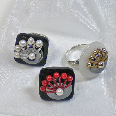 Made with a sturdy silver shank, square black horn platforms, round gemstone donut and beads. Knotted with nylon thread. Some rings in this series have square platforms